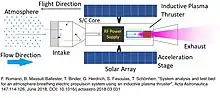 A special intake will be used to collect the gas molecules and direct them to the thruster. The molecules will then be ionized by the thruster and expelled from the acceleration stage at a very high velocity, generating thrust. The electric power needed can be provided by the same power subsystems developed for the actual electric propulsion systems, likely a combination of solar arrays and batteries, though other kind of electric power subsystems can be considered. An ABEP could extend the lifetime of satellites in LEO and VLEO by compensating the atmospheric drag during their time of operation. The altitude for an Earth-orbiting ABEP can be optimised between 120-250 km.[8] This technology could also be utilized on any planet with atmosphere, if the thruster can process other propellants, and if the power source can provide the required power, e.g. sufficient solar irradiation for the solar panels, such as Mars and Venus, otherwise other electric power subsystems such as a space nuclear reactor or radioisotope thermoelectric generator (RTG) have to be implemented, for example for a mission around Titan.