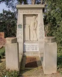 - August Dreesbach, together with his wife and various other family members, is commemorated by a large and impressive grave memorial in the form – according to one commentator - of an Egyptian temple entrance, at the Main Cemetery in Mannheim. The idealism and optimism of the first decade of the twentieth century can be inferred from the boldly carved “headline” at the top of the memorial: “Ein Sohn des Volkes wollt er sein” (“He wanted to be a son of the people”).[15]