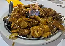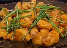 - Lemon chicken: consists of pieces of chicken meat that are normally deep-fried and coated with a sticky, sweet and sour lemon-flavoured sauce. Despite its lack of resemblance to authentic Chinese cuisine found in China, lemon chicken is very popular in Australian Chinese restaurants.[21]
