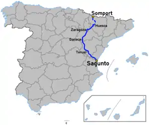 The highway currently runs from the town of Sagunto, near Valencia, to the town of Nueno, near Huesca. Between Nueno and Sabiñánigo there are several sections already converted to highway, although some others are either stopped or under construction. The highway also goes straight from Sabiñánigo to Jaca.