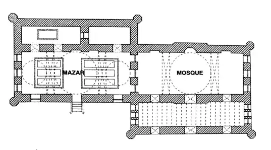 Shah Sufi Sayed Muhammad Dayem died in 1799 AD. He was buried on the southern side of the mosque. A three-domed building has been built over his grave. It is a rectangular structure, having four corner towers. This eastern wall has three arched entrances. Each doorway is placed within a projected wall, which is flanked by attached ferrets. Inside of the building, space is covered by three domes; the central dome is bigger than the others. The inner space contains other graves of the followers of Shah Sufi Muhammad Dayem. On the western side there is a verandah, probably extended in the later period.