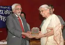 Mr. Mohammad Hamid Ansari, Vice President of India presenting a memento to Mrs. J. Robinson, 1st Principal of the Bal Mandir - Bal Vidyalaya, at the Golden Jubilee Celebrations of the Bal Hitkari Samiti, at Kota, Rajasthan on 15 May 2008.[1]