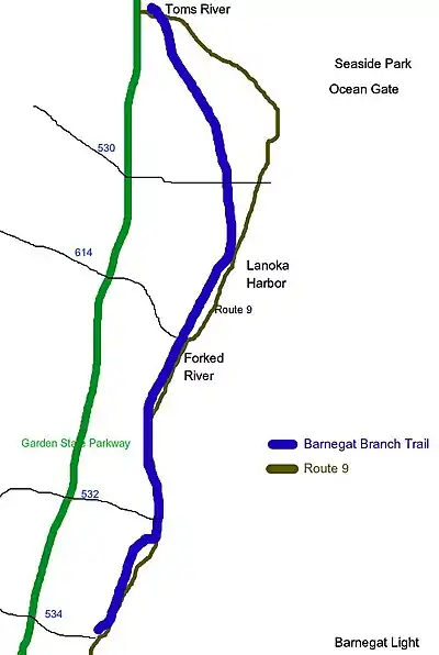 The trail occupies a 15.6-mile (25.1 km) abandoned rail corridor in Ocean County, New Jersey, that extends from Barnegat Township to Toms River.[1] The trail was built on the former Barnegat Branch Division roadbed of the Central Railroad of New Jersey (CNJ). The bankrupt CNJ was absorbed into Conrail in 1976, who terminated freight service the following year.[2]