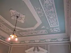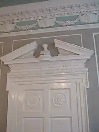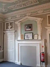 At the time of the 1731 fire the bachelor brothers John and William occupied a house in Blandford Forum that belonged to the Trustees of the William Williams charity. The Bastards had extensive workshops and premises at the rear of this building. After the fire they rebuilt the house at their own expense in exchange for the grant of a long lease of the premises from the Williams charity. The room known as the Bastards' Study or the Mezzanine Room was ornately decorated, unlike the rest of the house, and served as a showroom for their skills in plasterwork, woodwork and interior decoration.[3] The pediment of the overmantel is Palladian while the pediment of the door opposite is Baroque, this occurrence, coupled with the squat appearance of the composition, would not have occurred in the work of a major architect of the time, but was the Bastard's way of showcasing their versatility.