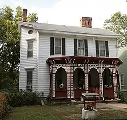 Constructed in 1865,[1] the Bates Building is a simple frame building with a gabled roof of shingles; it is three bays wide, and each side is a single bay. A significant exception to the house's simple construction is the ornate front porch, which appears to have been built after the rest of the house; complicated beveled woodwork covers the pillars of the porch. The eastern side of the house is otherwise the most distinctive part of the building; an outward projection on that side is the only exception to the house's rectangular shape, and included in the projection is a small oval window, which is the only non-rectangular window in the house.[2]