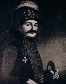 With the remaining ships Katsonis fled to the Ionian island of Ithaca, where he managed to reconstitute his forces and recruit more ships.[19] Despite his defeat, he was rewarded by Empress Catherine, on the recommendation of Grigory Potemkin, with promotion to Colonel and the Cross of St. George, 4th Class.[20] Katsonis and his fleet remained active in the Aegean and continued to score successes against Ottoman shipping. By the summer of 1791, Katsonis disposed of 21 ships.[21] In the meantime, however, the Russian victories at Măcin and Kaliakra led to the war's end with the conclusion of an armistice on 11 August 1791, followed by the Treaty of Jassy. Katsonis was ordered to cease operations.[22][23] Katsonis refused to obey and gathered his ships at Porto Kagio near Cape Tainaron, but was attacked there by a joint Ottoman–French fleet and his fleet was annihilated. Katsonis himself managed to escape to Russia with a few of his followers, settling at Livadiya in the Crimea.[24][25]
