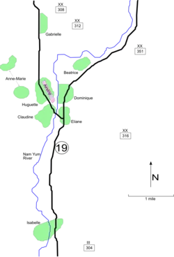 Starting in December, the French, under the command of Colonel Christian de Castries, began transforming their anchoring point into a fortress by setting up seven satellite positions. (Each was said to be named after a former mistress of de Castries, although the allegation is probably unfounded, as the eight names begin with letters from the first nine of the alphabet.) The fortified headquarters was centrally located, with positions Huguette to the west, Claudine to the south, and Dominique to the northeast.[43] The other positions were Anne-Marie to the northwest, Beatrice to the northeast, Gabrielle to the north, and Isabelle 6 km (3.7 mi) to the south, covering the reserve airstrip.[44]