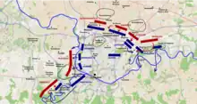In fact, the Allies were already getting dangerously close; on 25 June itself, as Reynac was negotiating his surrender, a detachment from Coburg's army was already trying to get to the ridge of Heppignies to fire rockets, an agreed-upon signal that the relief army had arrived. However, they were driven away by Championnet, whose division occupied the ridge, before they could get close. They were only able to launch their rockets from Frasne (modern Frasnes-lez-Gosselies), too far away to the north to be seen.[17] Around midnight on the day of the battle, an Austrian cavalry officer, Count Radetzky, did manage to infiltrate the French lines and actually reach the walls of Charleroi to discover it was already captured, but was then injured and chased by a French patrol on the way back later in the morning, and did not make it back to headquarters with his news until the afternoon, when the battle was already in full swing.[18]