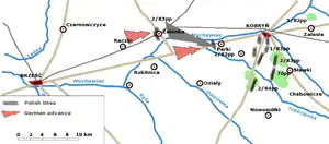 On 15 September the German 3rd Armoured Division encountered and destroyed a column of the 9th reserve light artillery depot. However, Epler's forces were not spotted until late evening of that day, when they were bombarded by the Luftwaffe. The following day the main force of the German XIX Corps arrived. The 2nd Battalion of the 84th Infantry Regiment together with an armoured train organised an ambush and attacked the Germans who were supported by a battery of artillery. Following six hours of combat, the Germans were forced to retreat with significant casualties. The Polish battalion seized several guns and tanks, but had to burn them due to lack of fuel and then retreated toward the main line of Polish defenses.