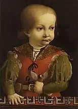 After a carefree year spent among many amusements, Beatrice found herself expecting a child. On 20 January 1493 Eleonora of Aragon returned to Milan to assist her daughter during childbirth and brought with her from Ferrara comare Frasina, the midwife of the family. Two days later at the Sala del Tesoro in the Rocchetta of the Castello Sforzesco the gifts of the Milanese nobility were exhibited on tables covered with crimson gold velvet, offered to the Moro in view of the imminent birth of his son.[24] Among these were "two beautiful diamonds" worth 18,000 ducats and a beautiful golden cradle, donated by his father-in-law Hercules. On 23 January Beatrice gave birth to her eldest son Hercules Maximilian, baptized after her father Hercules (Ercole), to whom she always had an unconditional love, and later named Maximilian in honour of the Emperor-elect Maximilian I.[25]