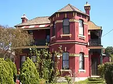 By 1820 a large part of the area had been subsumed by Joseph Underwood's large 'Ashfield Park Estate'. This property remained largely intact for more than 40 years, until it was subdivided into large blocks after the death of Elizabeth Underwood in 1858. By this time its proximity to the railway made it a desirable area (the station was originally called Fivedock).[9] One of these subdivisions was the 'Highbury Estate', on part of which Anthony Hordern, son of the founder of the great retail firm, Anthony Hordern & Sons, eventually built his house 'Shubra Hall', just beyond the west border of Ashfield. It later became part of the Presbyterian Ladies' College, the current boundaries of which give an idea of the extent of the Hordern property.[8] The College, including Shubra Hall, the main school building and the Meta Street entrance gates, is now listed on the Register of the National Estate.[10]