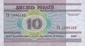 From the collapse of the Soviet Union until May 1992, the Soviet ruble circulated in Belarus alongside the Belarusian ruble. New Russian banknotes also circulated in Belarus, but were replaced by notes issued by the National Bank of the Republic of Belarus in May 1992.[4] The first post-Soviet Belarusian ruble was assigned the ISO code BYB and replaced the Soviet currency at the rate of 1 Belarusian ruble = 10 Soviet rubles. It took about two years before the ruble became the official currency of the country.[4]