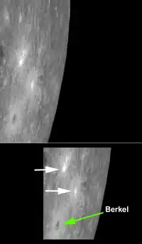 ![]() The two white arrows indicate neighboring bright craters, in contrast to Berkel's dark halo. | |