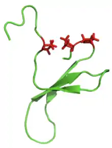 - Blanco, F. J.; Rivas, G.; Serrano, L. (1994). "A short linear peptide that folds into a native stable beta-hairpin in aqueous solution". Nat Struct Biol. 1 (9): 584–590. doi:10.1038/nsb0994-584. PMID 7634098. S2CID 35065527.