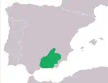 The Betic midwife toad is native to the Sierra Nevada Mountains in south eastern Spain. The population is fragmented as different mountains support separate populations. It is fairly common on Alcaraz, Segura and Cazorla Mountains but less common on the drier Filabres, Baza and Gádor peaks. It is generally found in oak and pine forests and in open rocky areas, mostly on limestone, at altitudes between 700 and 2,000 metres (2,300 and 6,600 ft). In drier parts it tends to be near springs.[1]