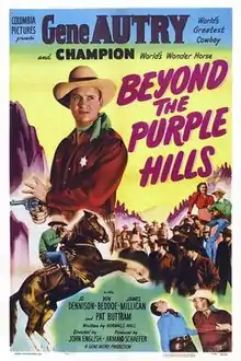 Beyond the Purple Hills is a 1950 American Western film directed by John English and written by Norman S. Hall. The film stars Gene Autry, Jo-Carroll Dennison, Don Beddoe, James Millican, Don Reynolds and Hugh O'Brian. The film was released on July 25, 1950, by Columbia Pictures.[1][2][3]