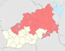| Districts | Bezhetsky, Bologovsky, Firovsky, Kalyazinsky, Kashinsky, Kesovogorsky, Kimrsky, Kimry, Konakovsky, Krasnokholmsky, Lesnoy, Likhoslavlsky, Maksatikhinsky, Molokovsky, Ostashkovsky, Ozyorny, Penovsky, Rameshkovsky, Sandovsky, Solnechny, Sonkovsky, Spirovsky, Torzhok, Torzhoksky, Udomelsky, Vesyegonsky, Vyshnevolotsky, Vyshny Volochyok |