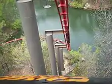 The train then entered a set of Block Brakes. Following the brakes, the train then turned right, and began to ascend a second lift hill. The second lift hill climbed towards the park's mock Rhine River. At the top of the 100-foot (30 m) lift, the ride turned 90 degrees to the left, before traveling down the climatic 80-foot (24 m) drop, barreling straight towards the river at 48 miles per hour (77 kilometres per hour), swooping to the left in close proximity to the water.