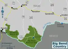 The Big Bend is part of the Trans-Pecos region in southwestern Texas, United States along the border with Mexico, north of the prominent bend in the Rio Grande for which the region is named.[1] Here the Rio Grande passes between the Chisos Mountains in Texas and the Sierra Madre Oriental in Mexico as it changes from running east-southeast to north-northeast. The region covers three counties: Presidio County to the west, Brewster County to the east, and Jeff Davis County to the north.[2]