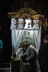 A remarkable item preserved here is the miraculous icon of Saint Anne given as a present to the monastery in 1407-1408 by Voivode Alexandru I's wife, Lady Ana. According to tradition,[note 1] the icon was given as a "patronage gift" to Lady Ana by empress Jelena, wife of Manuel II Palaiologos, emperor of Constantinople. The icon was restored in the 18th century and in 1853 was placed in a new section, made of carved and gilded wood, of the kliros.