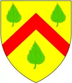 The Dennis family had been seated at Pancras Week in the parish of Bradworthy, Devon, since before the reign of King Henry II (1154-1189). The holder during that reign was Raph Dennis,[6] whose second son William Dennis founded the line of Dennis of Orleigh,[6] in North Devon. The family was of Danish origin and at the start of the age of heraldry (c.1200-1215) adopted for their arms: Azure, three Danish battle axes or. The name was created in Anglo-Norman French as le Daneis ("the Dane") and was Latinized as Dacus[1] ("Danish"), being the adjectival form of the noun Dacia, mediaeval Latin for "Denmark".