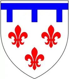 Robert Kirkham (died 1443), son and heir, who married Elizabeth Scobhull, widow of Robert Trebell and daughter and heiress of Sir Robert Scobhull (alias Scobhill, Scobhul, Scobbahull, etc.) [11] of Scobhull in the parish of South Pool near Kingsbridge, Devon.[12] The arms of Scobhull (Argent, three fleurs-de-lys gules a label of three points azure[13]) were quartered by Kirkham.