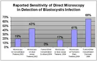 For identification of infection, the only method clinically available in most areas is the ova and parasite (O&P) exam, which identifies the presence of the organism by microscopic examination of a chemically preserved stool specimen. This method is sometimes called direct microscopy. In the United States, pathologists are required to report the presence of Blastocystis when found during an O&P exam, so a special test does not have to be ordered. Direct microscopy is inexpensive, as the same test can identify a variety of gastrointestinal infections, such as Giardia, Entamoeba histolytica, and Cryptosporidium. However, one laboratory director noted that pathologists using conventional microscopes failed to identify many Blastocystis infections, and indicated the necessity for special microscopic equipment for identification.[9] The following table shows the sensitivity of Direct Microscopy in detecting Blastocystis when compared to stool culture, a more sensitive technique. Stool culture was considered by some researchers to be the most reliable technique, but a recent study found stool culture only detected 83% of individuals infected when compared to polymerase chain reaction (PCR) testing.[62]
