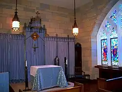 The chapel's stained glass-window is situated in the center of the façade of Keating Hall, and is illuminated from within during the evenings.[9]