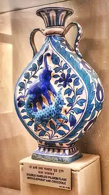 Blue Pottery is widely recognized as a traditional craft of Jaipur of Central Asian origin.[1] The name 'blue pottery' comes from the eye-catching cobalt blue dye used to color the pottery. It is one of many Eurasian types of blue and white pottery, and related in the shapes and decoration to Islamic pottery and, more distantly, Chinese pottery.