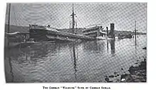 By the time von Spee withdrew his ships, large portions of the town had been destroyed. Two entire blocks of Papeete had burnt to the ground before the fires were finally put out. A copra store, a market, and several other buildings and residences were among those destroyed by the shellfire and resulting inferno. While the majority of Papeete's civilians fled to the interior of the island as soon as the fighting began, a Japanese civilian and a Polynesian boy were both killed by German shellfire. Although the two French vessels in the harbor had been sunk, there were no military casualties on either side and the German vessels took no damage. Overall, the bombardment was estimated in 1915 to have caused over 2 million francs' worth of property damage, some of which was recouped through the seizure of a German store on the island.[4] In addition to the seizure of their property, several local Germans were interned and forced to repair the damage von Spee's squadron had caused. Perhaps the most lasting effect of the bombardment on the French was the dramatic fall of copra prices in the region, as local suppliers had previously sold a majority of their produce to German merchants in the area who were now interned.[17] Further havoc and distress spread throughout the island 18 days after von Spee's squadron had left when rumors started to spread that a second German bombardment was about to begin.[4]