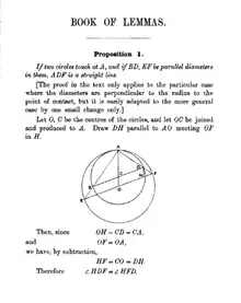 The Book of Lemmas or Book of Assumptions (Arabic Maʾkhūdhāt Mansūba ilā Arshimīdis) is a book attributed to Archimedes by Thābit ibn Qurra, though the authorship of the book is questionable. It consists of fifteen propositions (lemmas) on circles.[1]