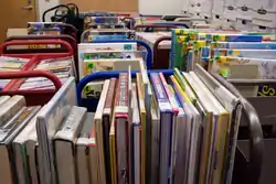 A book truck, book trolley, or book cart is a small wheeled vehicle, typically with two or three shelves, used in libraries to move books.[1]