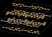 The boron atoms in B2S3 are trigonal planar, and are arranged in B3S3 and B2S2 rings with bridging S atoms forming a layer structure with an interlayer distance of 355 pm. This is different from boron trioxide which has a three dimensional structure.[6]