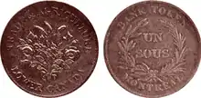 Bouquet sou were a series of tokens that were created for use primarily within Lower Canada in the mid- to late-1830s. Roughly equivalent in value to a half penny, the "bouquet sou" were so called because they displayed a group of heraldic flowers tied together with a ribbon on their obverse. The group of flowers were encircled by one of several legends, which might say "Trade & Agriculture / Lower Canada", "Agriculture & Commerce / Bas Canada" or some variant of these that might also substitute the name of the issuing bank. The other side most typically gave the denomination of "un sou", surrounded by a wreath and the words "Bank Token" and "Montreal". There are a large variety of these tokens, distinguished primarily by the number and variety of flowers that appear in the "bouquet", along with the differences in the legends that appeared on either side of the token. They were initially issued by the banks of Lower Canada, and were later imitated by speculators who produced tokens that looked similar, but were underweight for their denomination. These coins also circulated to Upper Canada, as at least one archeology dig attests.[1] Large numbers of these tokens were produced and many examples can easily be obtained for only a few Canadian dollars, though a few rare varieties can command significantly higher prices.[2]