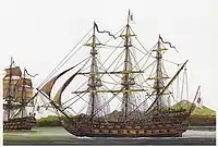 On June 12, accompanied by two more ships, Pedro I entered the port of Bahia and tried to attack the Portuguese fleet that was anchored there. The lack of wind and the low tide frustrated Cochrane's attack. On July 2, it left with the other ships of the fleet in pursuit of the Portuguese way up the Equator line, managing to capture many enemy ships, however, admiral Cochrane decided to return on July 17 to subdue the northern parts of Brazil that were still under Portuguese control.[16][17] On July 26, Pedro I arrived in São Luís, capital of the captaincy of Maranhão, which was still occupied by the Portuguese. After entering the port, a feat never hitherto carried out by a ship of that type, and making an elevation shot over the city in such a way that terrified the Portuguese occupiers, Cochrane told the Portuguese his ship was the spearhead of a large Brazilian fleet, the strategy worked and the Portuguese surrendered the town on July 31. It was immediately incorporated into the empire. For this service Cochrane was awarded the noble title of Marquis of Maranhão.[18][17]