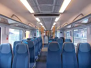 South Western Railway, as part of its franchise award in 2017, has carried out a refurbishment programme on its Class 450 fleet. As part of this, every unit has been deep cleaned with carpets and seat covers replaced and every two seats in Standard Class have had a plug socket fitted. First Class has been reduced to eight seats per set end (16 seats per set), and features new leather seats and tables with wireless charging facilities. As part of this work, Class 450/5s have also been similarly refurbished, and renumbered to their original numbers, so all Class 450s will once again share a common layout.[12]