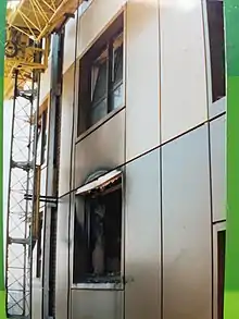 The design of retrofitted cladding was strongly implicated in the devastatingly rapid spread of the Grenfell Tower fire which killed 72 people in a similarly-designed tower block in London in June 2017. As a result, safety inspections were carried out on all tower blocks across the country which had been retrofitted with replacement cladding. The cladding applied to Hanover House was the only tower block cladding in Sheffield which failed fire safety tests, and it was subsequently confirmed by Sheffield City Council that it would be removed.[8] Removal of the cladding commenced in July 2017 and was completed by the end of the year. Replacement cladding, identical in visual design but now passing fire safety tests, was applied to the building from April 2019 onwards, restoring Hanover House to its pre-Grenfell appearance by the start of 2020.