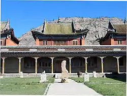 The Bugut inscription (Mongolian: Бугут, romanized: Bugut) is a multi-lingual inscription first discovered in Ikh-Tamir sum of Arkhangai Province, Mongolia. The inscription is dated to 584 CE and was dedicated to Taspar Khagan (reigned 572–581) the fourth Khagan of the Turkic Khaganate. The inscription is in the form of a monumental wolf-crowned stele 198 cm high that sits on a turtle base 47 cm high. The front, right and left side of the stele has a Sogdian inscription written with Sogdian alphabet. The back side has a possibly Ruanruan inscription written with Brahmi script.[1] The original location of the inscription on the west bank of the Bayantsagaan river, a tributary of the North Tamir river, shows evidence of a walled complex. The wall embankment is 59mx30m with an inner moat 4.5m wide and 2m deep. In the center of the walled complex was a temple whose wooden pillars and roof tiles were still visible on the ground. Only a few brick fragments were found. The inscription itself was found within the walls on a square platform 7.5mx7.5m made of layered stones.[2]