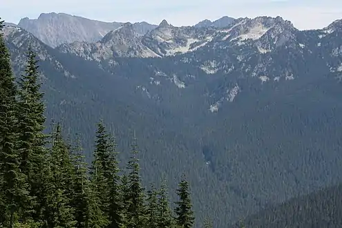 During the Pleistocene period dating back over two million years ago, glaciation advancing and retreating repeatedly scoured the landscape leaving deposits of rock debris.[7] The last glacial retreat in the Alpine Lakes area began about 14,000 years ago and was north of the Canada–US border by 10,000 years ago.[7] The "U"-shaped cross section of the river valleys are a result of that recent glaciation. Uplift and faulting in combination with glaciation have been the dominant processes which have created the tall peaks and deep valleys of the Alpine Lakes Wilderness area.
