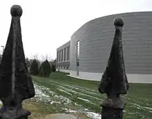 Today, one of the Burchfield Penney's main goals is to be unique and inviting to the public.[2] Its "Front Yard" exhibit features three tall steel projectors which project constantly-changing artwork onto the exterior of the building.[3] According to Buffalo News critic Colin Dabkowski, "The Front Yard thwarts immediate judgement because it is always in a state of becoming something else." (para. 16).[4] The museum continually connects to educational institutions, specifically Buffalo State College.[5]