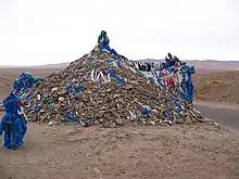 It has given authenticity to the spiritual nature of the mountain. As a result, regular pilgrimage is undertaken by the people to the three sacred major ovoos or stone cairns at the sacred sites along a specified route where Mongolian shamanic worship is offered.[4]: 12 The specified route is unique and covers: Main Ovoo of Heaven at the pinnacle of the mountain via Gurvan Khoriud ("Three Forbidden Precincts"); the Uud Mod ("Two Trees of Entrance"); the Bosgo Tengeriin Davaa ("Threshold Pass of Heaven"); the catchment of the Kherlen River and the Sacred Bogd Rivers; and finally to the Beliin ("Lowest") ovoo.[4]: 12