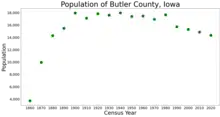Butler County is a county located in the U.S. state of Iowa. As of the 2020 census, the population was 14,334.[1] Its county seat is Allison.[2] The county was organized in 1854 and named for General William O. Butler.[3]