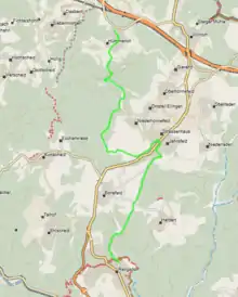 From its starting point at the St.-Kastor Chapel in Rengsdorf, the trail follows the Völkerwiesenbach valley through beech grove to the hut Philippsruhe at the Kreisstraße 105. Crossing this street, the trail passes Bonefeld in the direction of Strassenhaus. There is the option to follow a small detour to the Alteburg Bonefeld, a monument of the Middle Ages, and the Keltengräber (Celtic graves). The trail crosses the K105, and goes along a replica of a charcoal production hill and through the sequoia forest, then crossing the B256 in Strassenhaus. The trail follows the direction Schöne Aussicht, with a view on the pit frame of the abandoned Grube Georg, and leads through the Fockenbach valley in the direction Hümmericher Mühle (Hümmerich mill). Passing the Alexander gallery and the quarry Louisenglück, after a final rise the trail reaches Hümmerich with its weighing scale museum.[1]