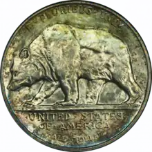 Nevertheless, Coolidge signed the bill, which became the Act of February 24, 1925, authorizing all three coins.[8] This was the first time commemorative coin legislation covered more than one issue.[9] A total of 300,000 for the California piece was authorized, with the coins to be drawn at face value on behalf of the Citizens' Committee by the San Francisco Clearing House Association or the Los Angeles Clearing House Association.[8] The latter group of banks had in 1923 distributed the Monroe Doctrine Centennial half dollar.[10]