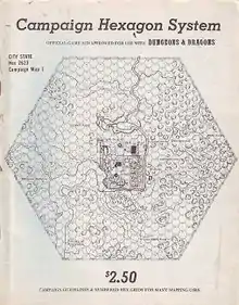 Campaign Hexagon System is a booklet of which the main portion is devoted to over 60 blank campaign hex grids. A rectangular hexagonal tessellation of about 1000 small hexes appears on each page, and on this grid is superimposed a large hex representing 5 miles across flats. The booklet also contains other guidelines generally relevant to a fantasy wilderness campaign, including Keen Sighting, Hydrographic Terrain (such as rivers and streams), Movement Obstacles, Prospecting (for ore, precious minerals, and the like), Flora Types, Vegetables, and Fauna Classifications.[2]