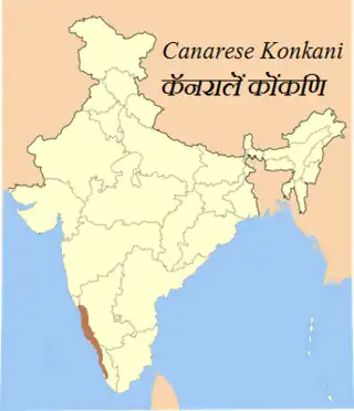 Canarese Konkani are a set of dialects spoken by minority Konkani people of the Canara sub-region of Karnataka, and also in Kassergode of Kerala that was part of South Canara.[note 5][1] Kanarese script is the primary mode of writing used in Carnatacan Konkani, as recognised by the Konkani Academy.