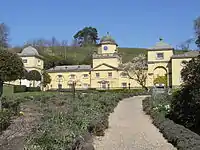 The house is surrounded by landscaped grounds containing many picturesque structures and decorative points-de-vue. The former include three small classical-style Greek temples, the Sunrise Temple (1831), the Sunset Temple (1831) and Satyr's Temple (1861); the Traveller's Cross, erected in 1831, but formerly situated on a roadside near North Aller; Ugley Bridge (1861), an imitation of an old Devon packhorse bridge; The Sybils' Cave (1861), filled in while the house served as a home for evacuated children during World War II, but since re-opened. The ancient parish church formerly situated next to the former pre-Palladian manor house was demolished in 1732 by Lord Clinton with the licence of Stephen Weston, Bishop of Exeter, and was rebuilt to a new design in its present position some 1 mi (1.6 km) to the west of the house, visible from the terrace. This made available an unencumbered site for the planned landscaping. Other points-de-vue include the Sham Castle, the Triumphal Arch, the Ebrington Tower and the Sham Village (now demolished).