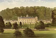 A circular library was added in the early 19th century. In 1841 the architect Edward Blore (1787–1879) added a porte-cochere on the north side of the main range, now demolished and replaced in 1974 by an entrance porch to the design of Raymond Erith. Blore also refashioned the entrance hall and stairs and added a top storey with mansard roof. In 1861 Blore added at the east side of the house service wings and stables, thus considerably elongating the southern appearance of the building beyond the east wing. The service wing is set back from the east wing by the width of the entry road which passes directly in front of it, and is topped in its centre by a clock tower. Adjoining it on its east end and extending backwards to give the ensemble an L-shape, is Blore's stable block. This has small circular windows with portrait busts, and is pierced on its long eastern face by the imposing full height main entrance arch, through which vehicles pass and continue past the front of the service wing and through decorative inner gates into the courtyard situated between the north facade of the main range and the steep and rocky hillside.
