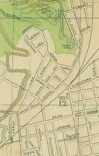 The few residents of the area during this period included M. Atwater, J. Matlby, R. Atwater and R. Augur. Major Lyman Atwater (Lyman Street was named after him) and son Lyman Hotchkiss Atwater also were born and lived in Cedar hill. Elias B. Bishop married the Major's daughter Grace (Grace Street in Cedar Hill is named after her; at one time it was the road around the bottom of East Rock and is now partly called Rock Street and English Drive[8]) and bought the Atwater House on State Street, Cedar Hill from the Major when he moved to Vermont. Henry Eld[9] had lived in the area now known as View Street, but when it started becoming more populated he relocated. Charles A. Warren President of the State Street House Railroad Company took over the property his office was at 82G Grand Street, Atwater building.[10][11]