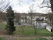 At the other edge of the main house's pond is a small Gothic Revival building known as the Mill, although it was never used as such and remains purely decorative, used mainly for storage. Its brick basement gives way to a board-and-batten first floor, with heavy surface decoration, and then to a slate-covered cross-gabled roof with decorated bargeboards and filials, topped by a brick chimney. The windows have been trimmed with arches of various shapes and other decorative touches. The main side window has 'W' 'C' 'B' (William Cullen Bryant's initial) etched in the top panes.[1]
